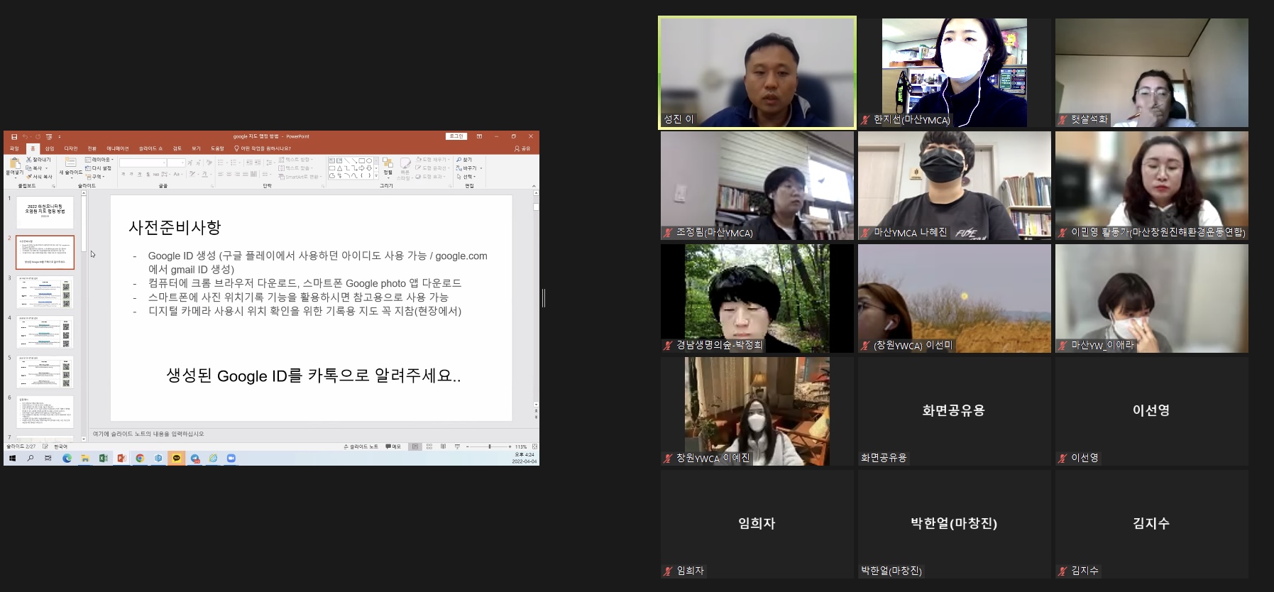 2022년 4월 4일(월) 온라인으로 마산만 특별관리해역 오염원 감시활동 워크숍을 실시하였습니다. 경남생명의 숲, 마산창원진해환경운동연합, 마산YMCA, 마산YWCA, 창원YWCA, 창원시지속가능발전협의회 등 실무자 13명이 참석했습니다. 창원지역 하천의 오염원을 조사하고 참석자들이 함께 오염원 지도를 만들게 됩니다. 2017년 부터 진행되었던 조사결과는 행정에 전달되고 오염원 차단이 진행되고 있습니다. 올해 조사를 통해 오염원 차단이 잘 이뤄지고 있는지 새로운 오염원 유입은 없는지를 파악할 예정입니다.