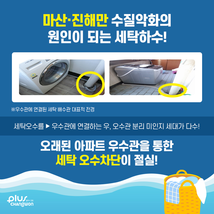 창원시에서는 발코니 우수관에 잘못 설치된 세탁 오수관을 제대로 연결하기 위한 캠페인을 진행하고 있습니다.