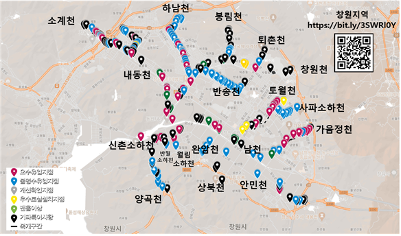 2022년 4월 5일 부터 6월 30일 까지 창원천, 남천, 토월천, 가음정천, 봉림천, 하남천, 소계천, 내동천, 반송소하천, 사파소하천, 양곡소하천, 월림소하천, 신촌소하천, 적현천, 완암천(상곡천), 안민천 등 창원지역 16개 하천을 모니터링하였습니다. 장군천, 산호천, 삼호천, 양덕천, 교방천, 회원천, 창원소하천, 척산천, 팔용천 등 마산지역 9개하천. 여좌천(평지천), 여좌2가천, 중초천(경화2가천), 구이동천, 경화3가천, 병암천, 동방천, 신이천, 자은천, 대장천, 두동천(장천천, 무명천, 동천) 등 진해지역 14개 하천을 모니터링하였습니다.